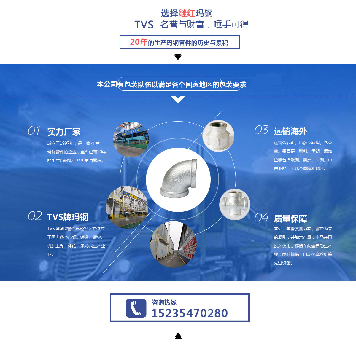 近幾年來,本公司亦開始涉足國內瑪鋼管件的生產和銷售。TVS牌瑪鋼管件已經打入并供應于國內各個市場。